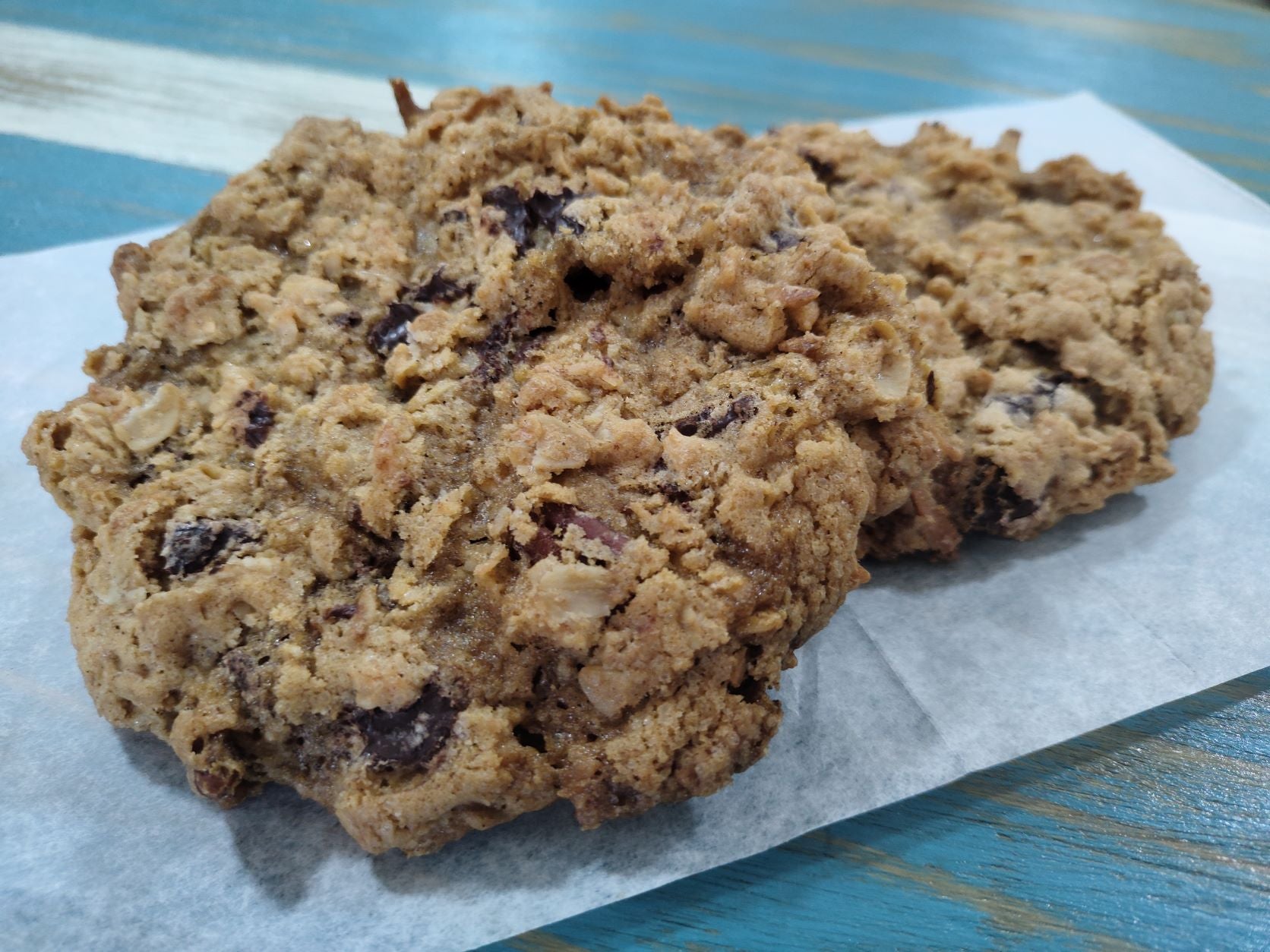 A cookie packed to bursting with oats, chocolate chips, pecans, and coconut.