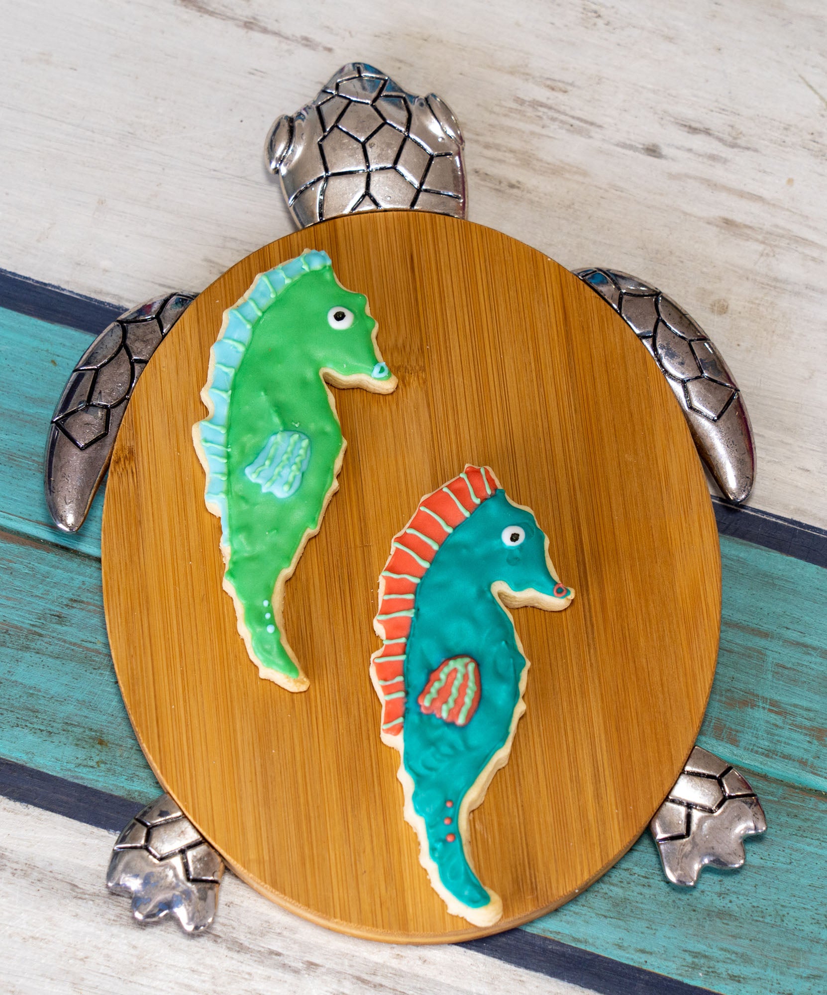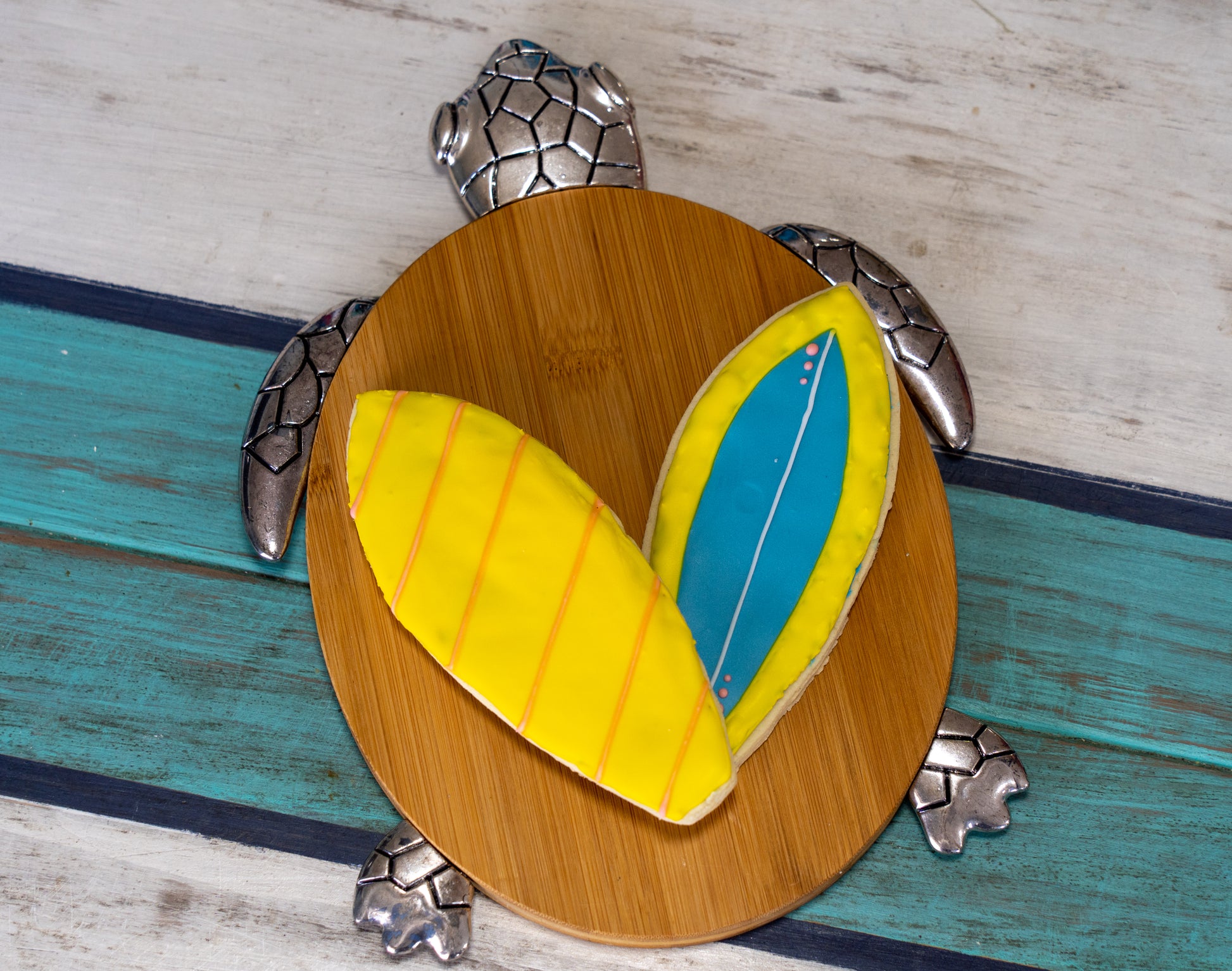This tender, vanilla bean infused sugar cookie is sure to impress. Each cookie is approximately 4.5 inches long. Choose from our beachy shapes including surfboard, turtle, mermaid tail, seahorse, palm tree, or sea bird. Custom designs are available upon request! For orders of 24 or more, please reach out for customization and volume discount pricing.