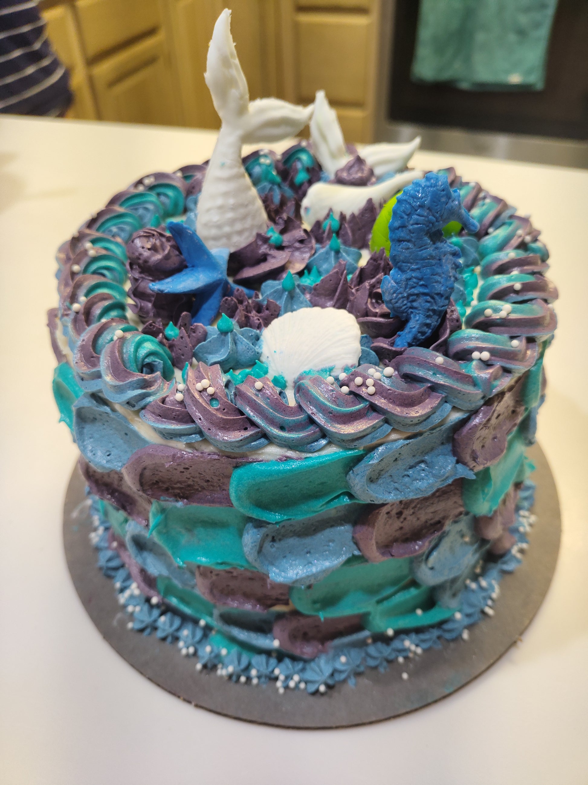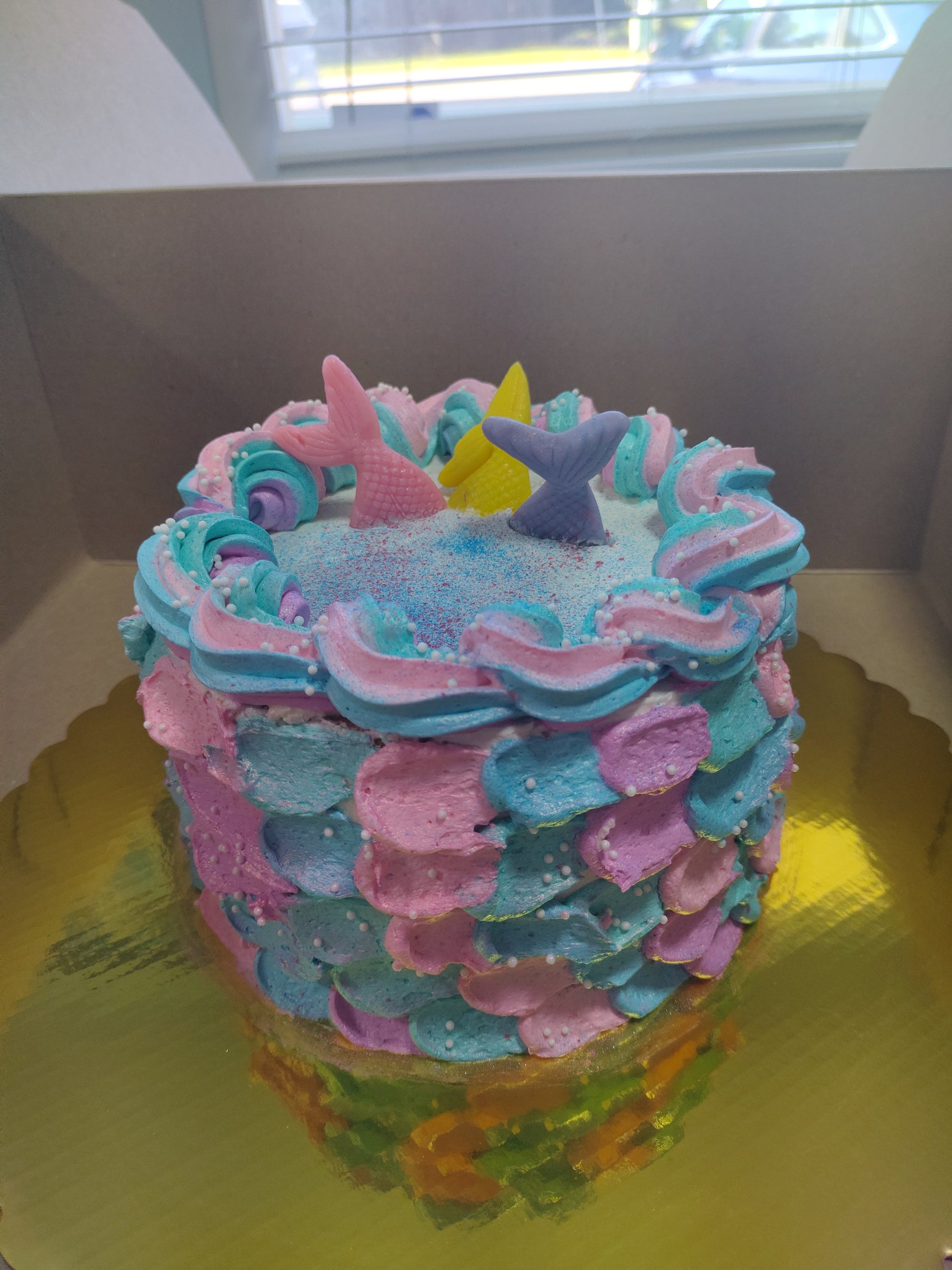 A 6 inch round cake decorated with bright, mermaid themed icing! Top includes some fondant beach decorations and sprinkles. Must be ordered a minimum of 3 days before deisired pick up date. Please include any information about cake flavor or birthday message when ordering.