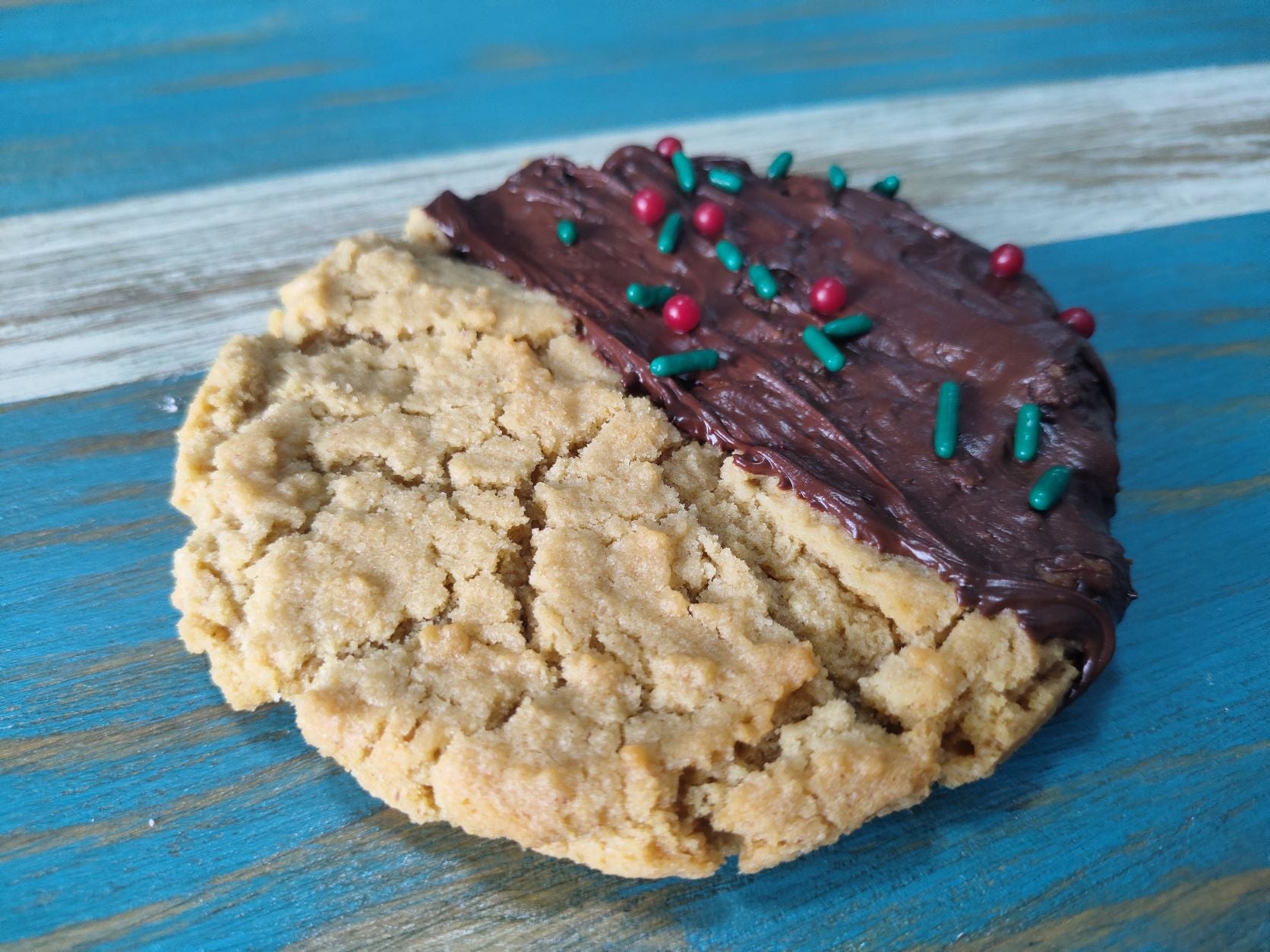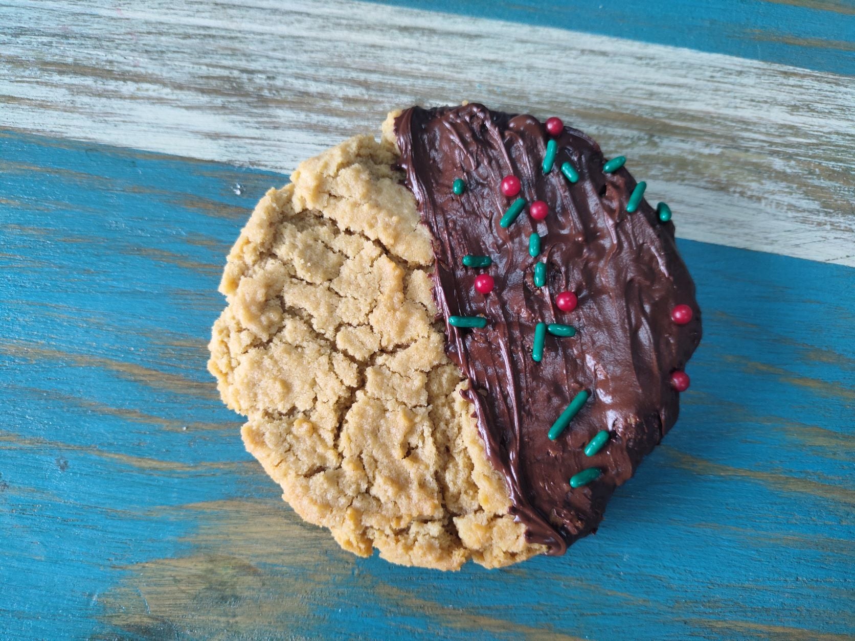 A classic soft peanut butter cookie, covered in a semi-sweet chocolate and decorated with sprinkles!